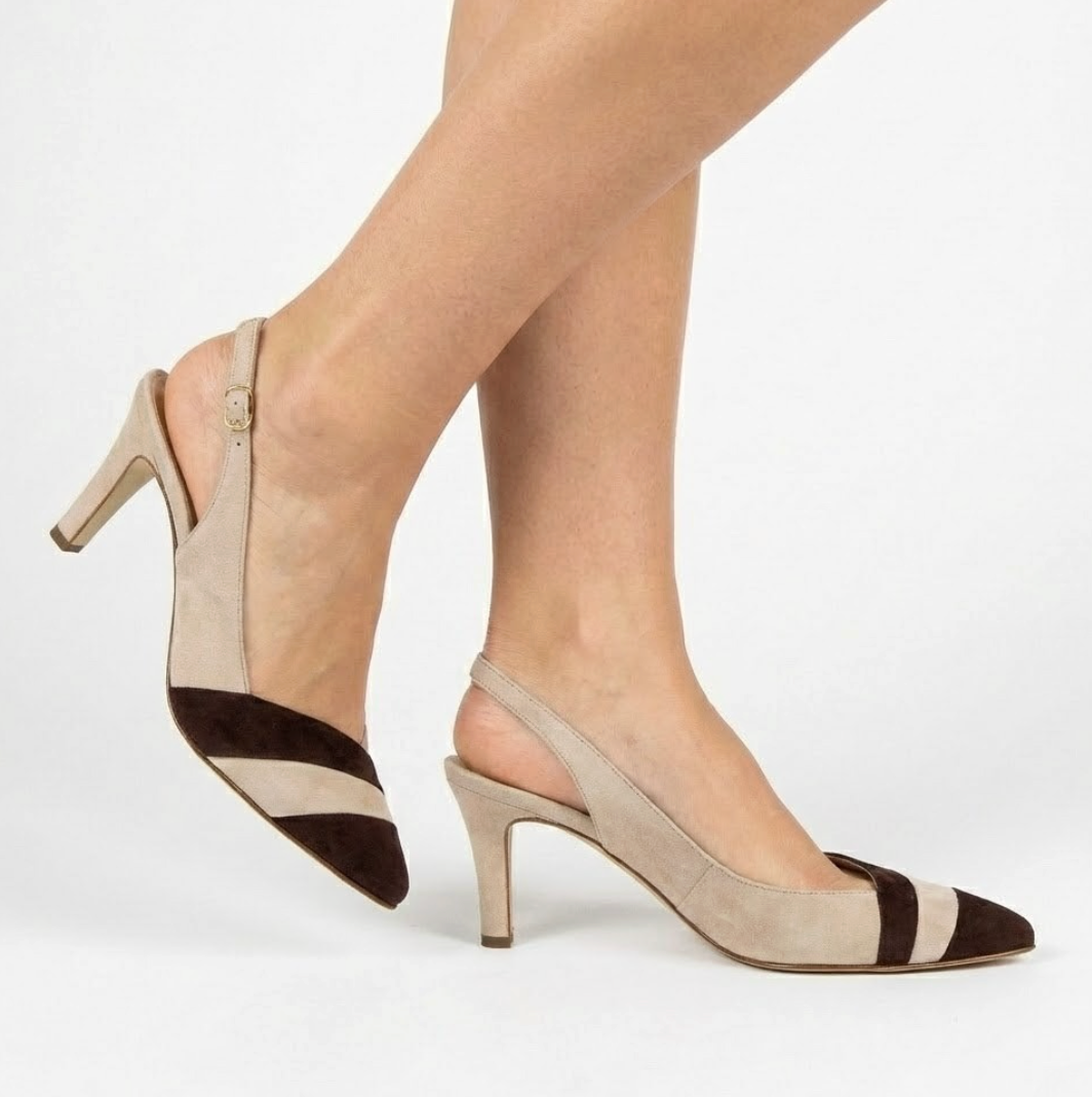 DÉCOLLETÉ SLINGBACK IN CAMOSCIO BEIGE E TESTA DI MORO CON PUNTA SFILATA E TACCO ALTO