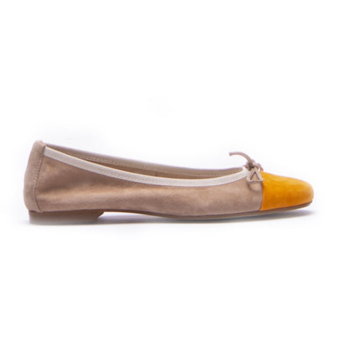 La ballerina presenta un design bicolore raffinato, con una punta colorata che dona carattere e personalità a questa scarpa classica.