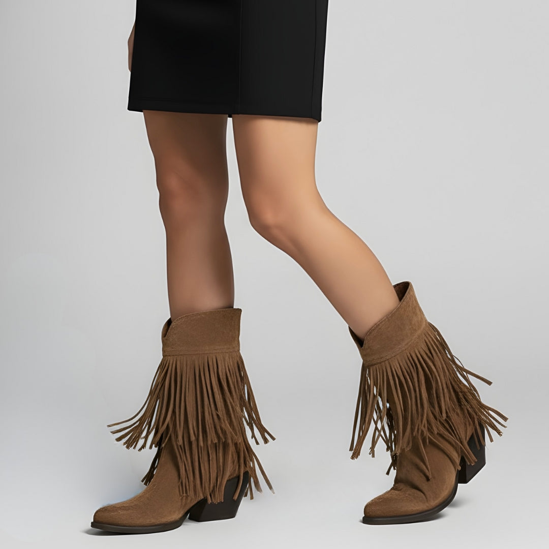 Perfetto con jeans skinny, abiti midi o gonne dal taglio boho, lo stivale texano con frange diventa un must-have di stagione per chi ama distinguersi con stile.