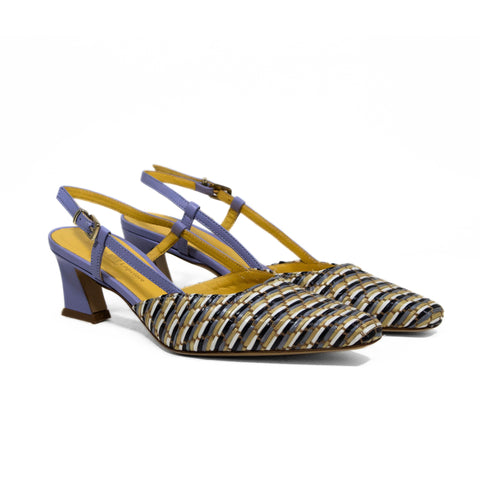 La vera protagonista è la tomaia, realizzata in rafia intrecciata con un motivo multi-tone che gioca tra giallo senape, indaco e blu scuro.