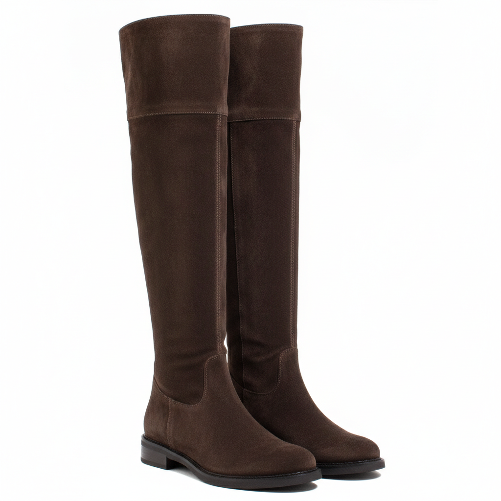 STIVALE SOPRA IL GINOCCHIO IN CAMOSCIO MORO CON SUOLA BASSA