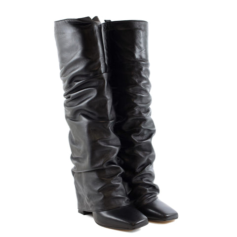 Questi stivali da donna in pelle nera con effetto stropicciato sono la scelta perfetta per chi desidera una calzatura dal look moderno e ricercato. Realizzati in pelle morbida di alta qualità, presentano una silhouette slouchy che dona carattere e valorizza qualsiasi outfit.
