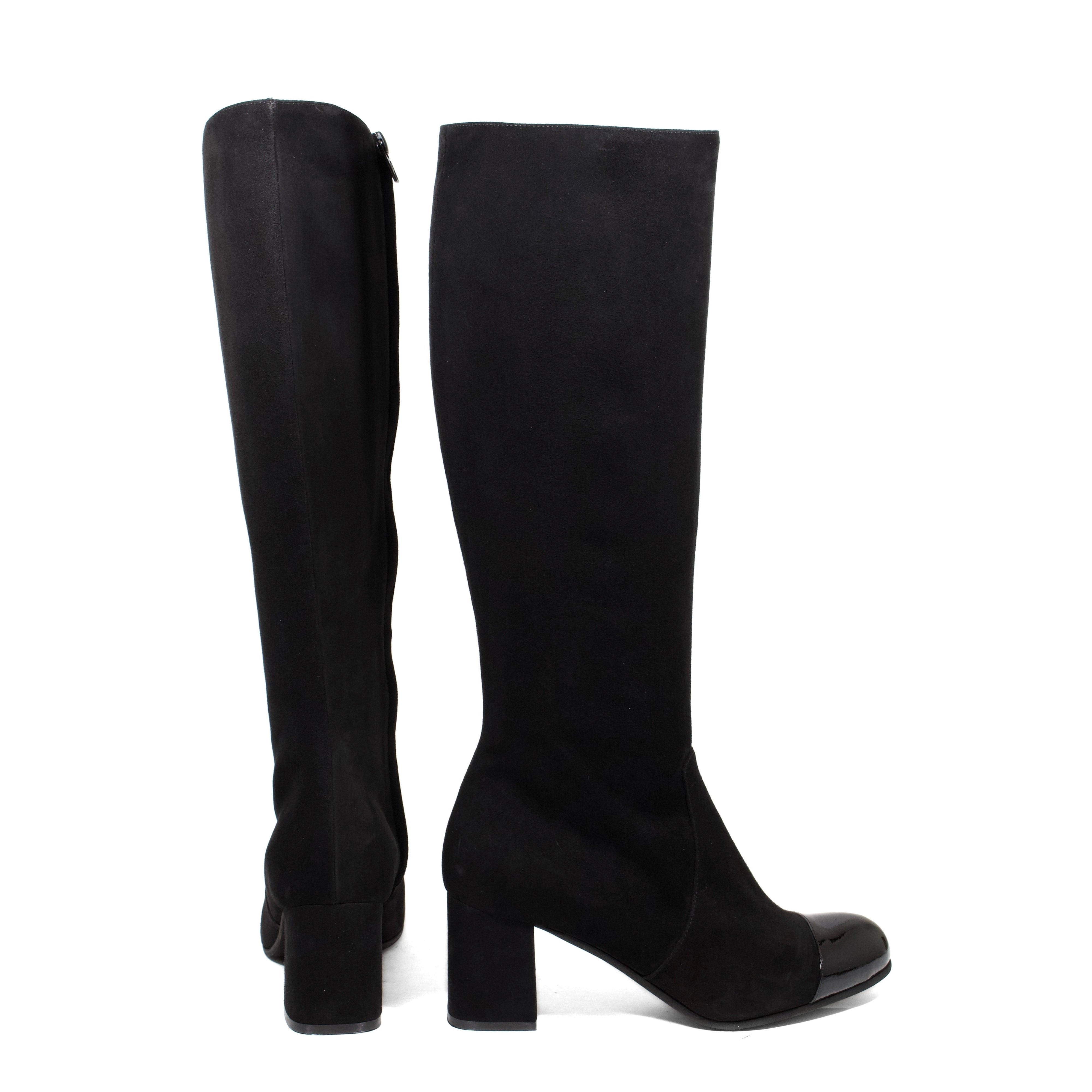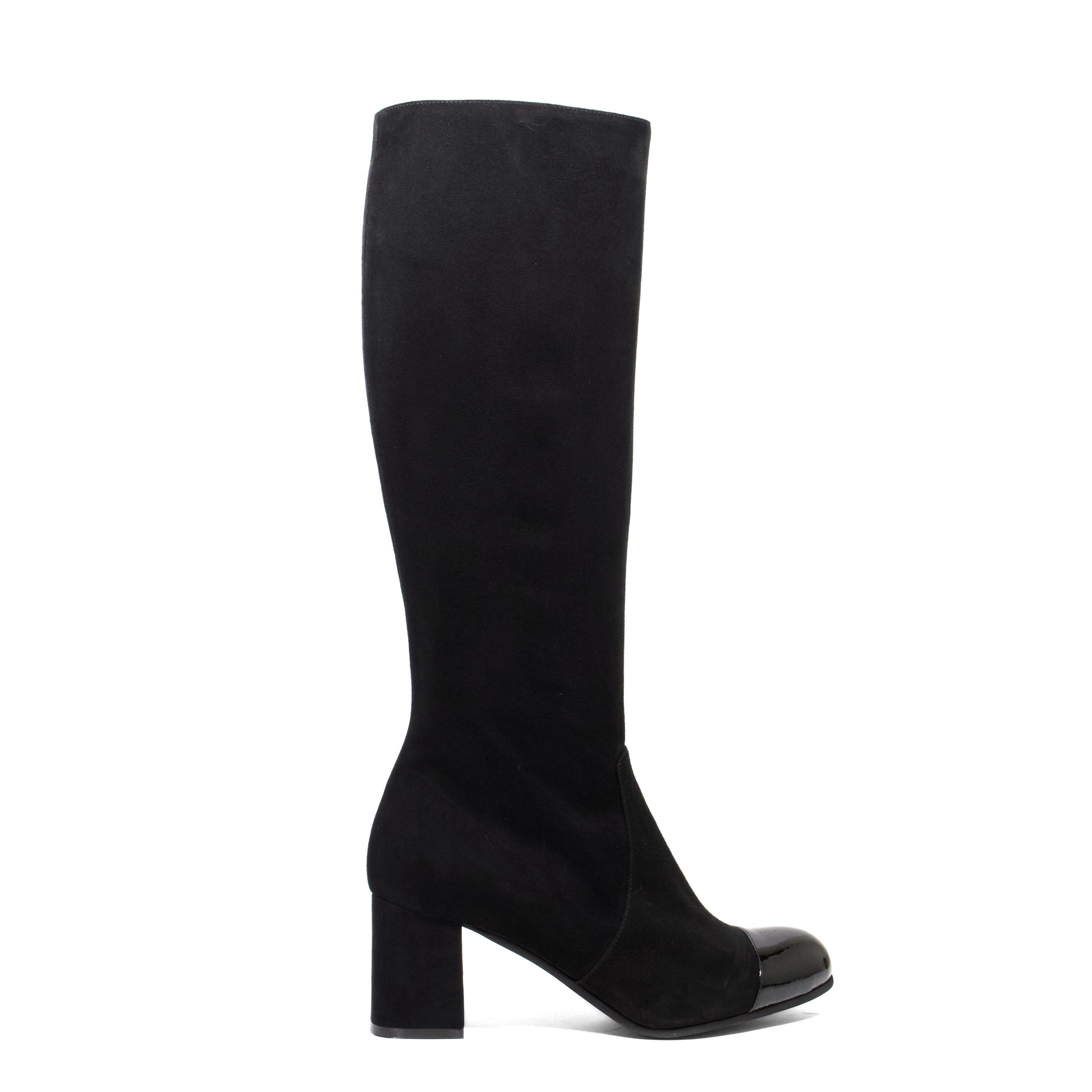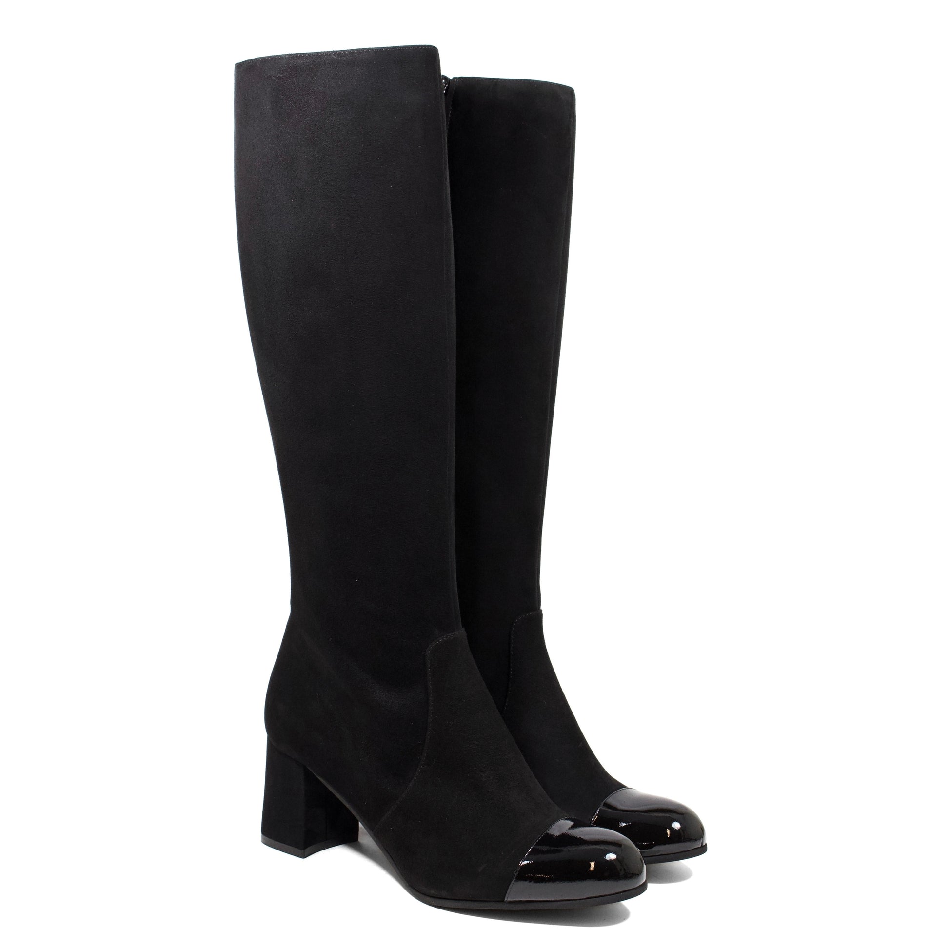 STIVALE ALTO A PUNTA ARROTONDATA IN CAMOSCIO NERO CON PUNTA IN VERNICE NERA TACCO A BLOCCO MEDIO