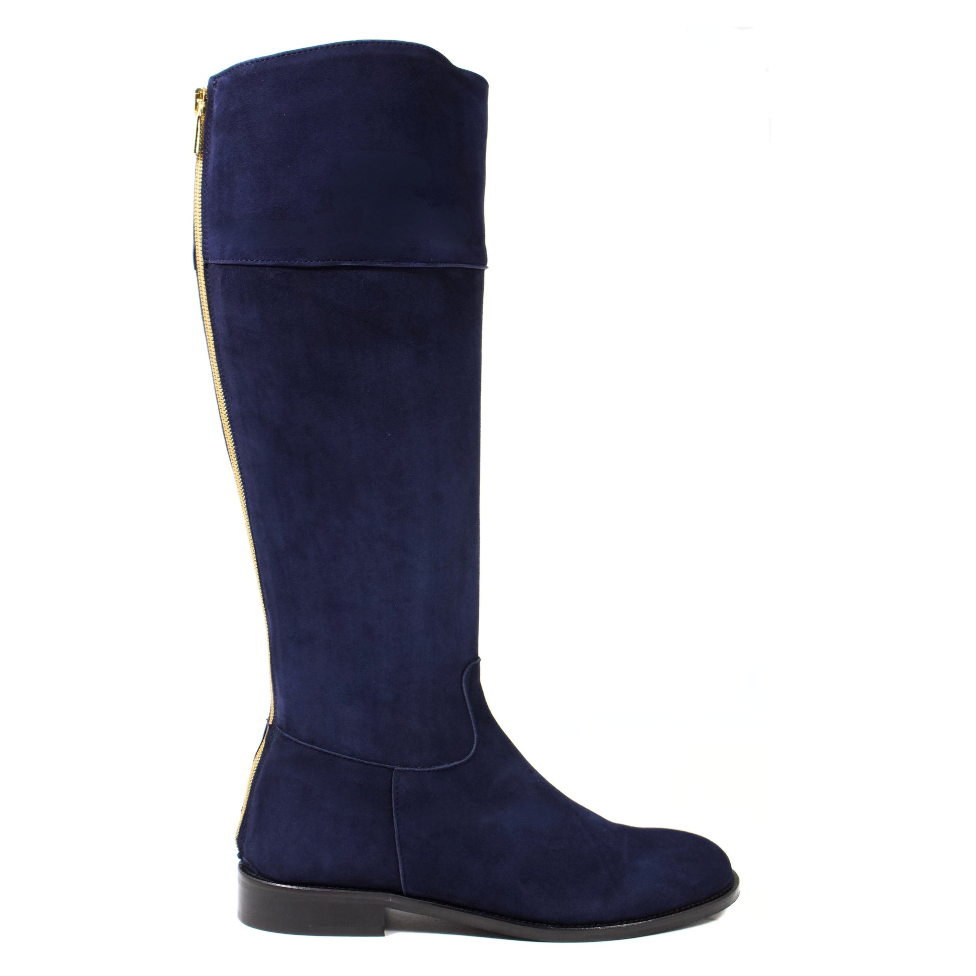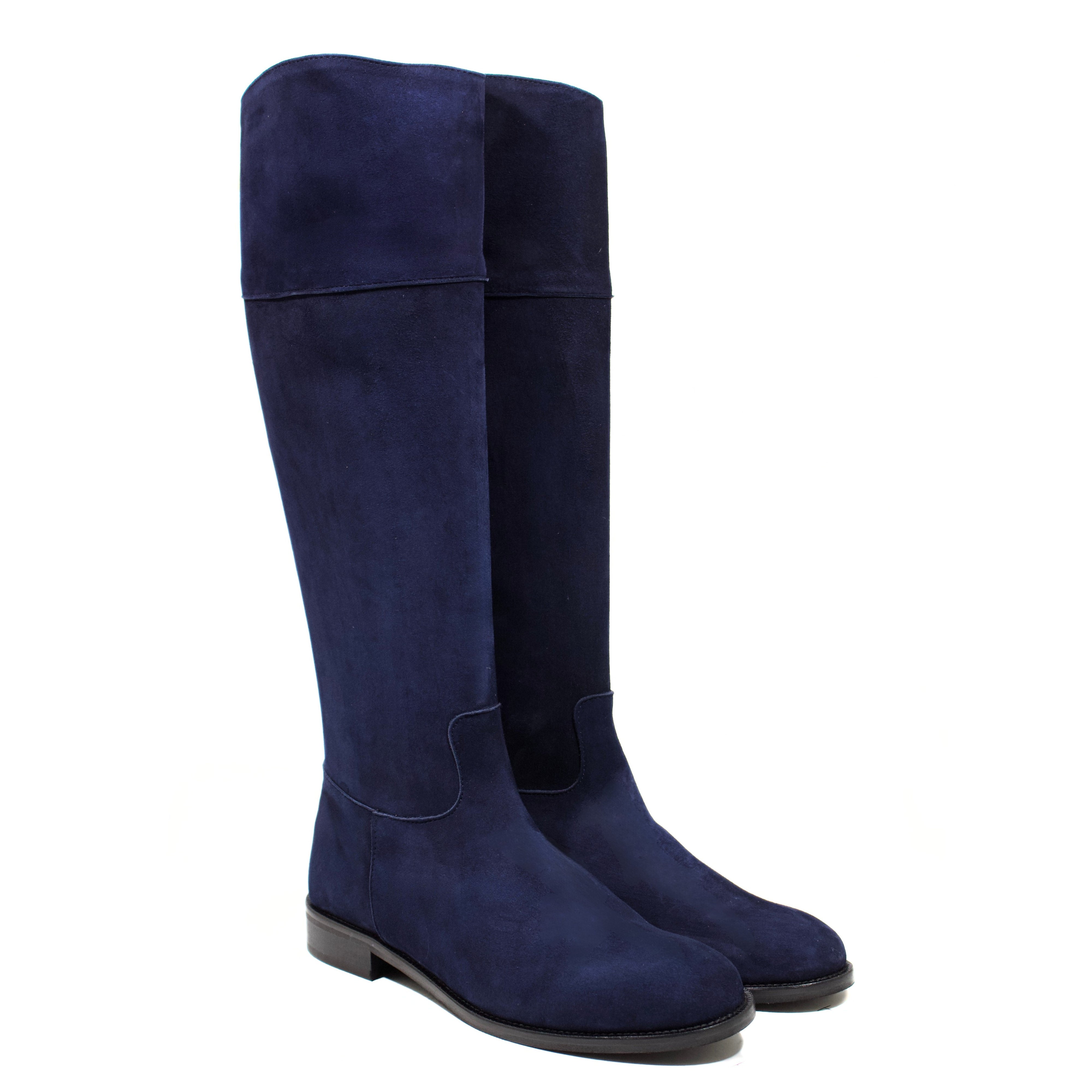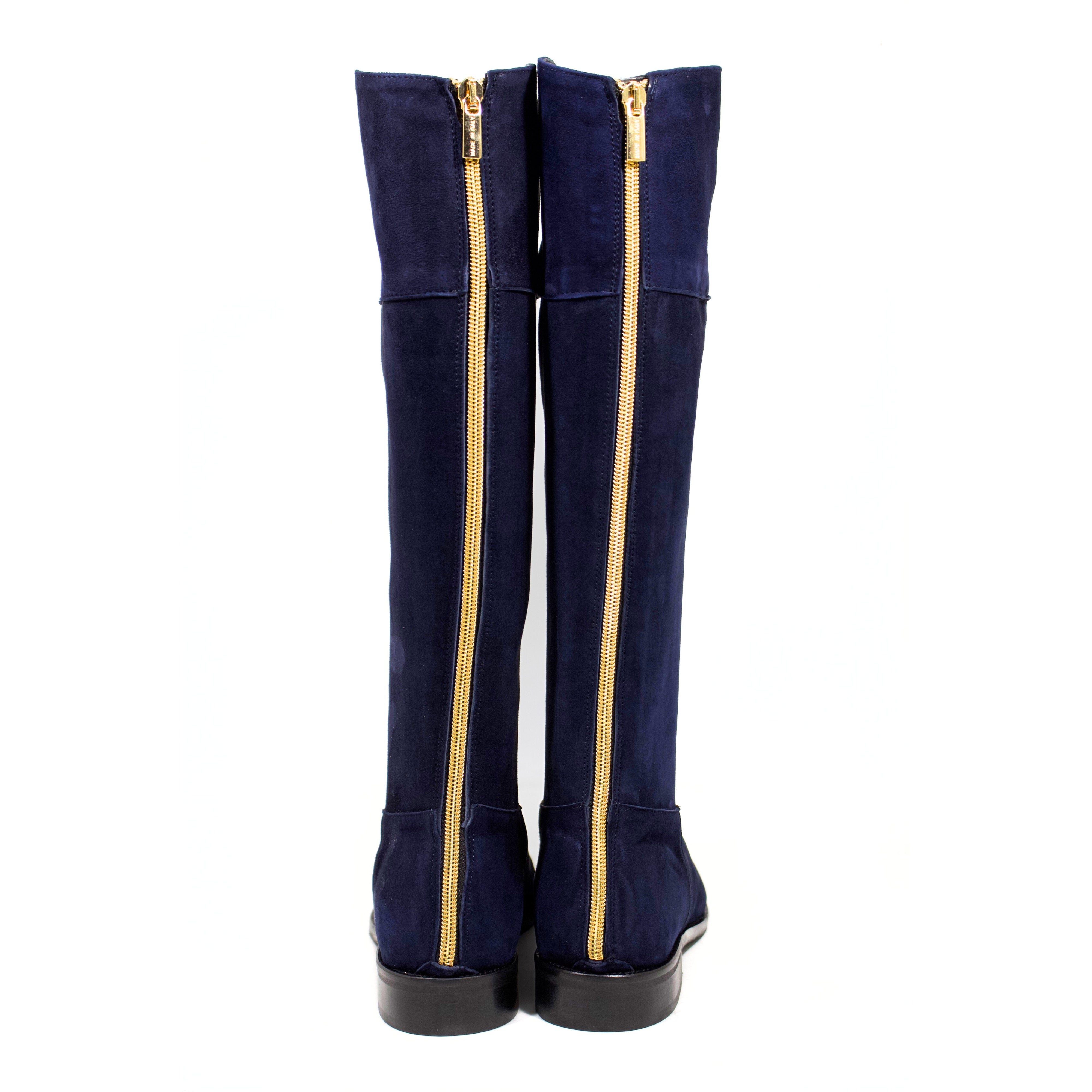 STIVALE ALTO A PUNTA ARROTONDATA IN CAMOSCIO BLU CON ZIP POSTERIORE ORO E TACCO BASSO A BLOCCO