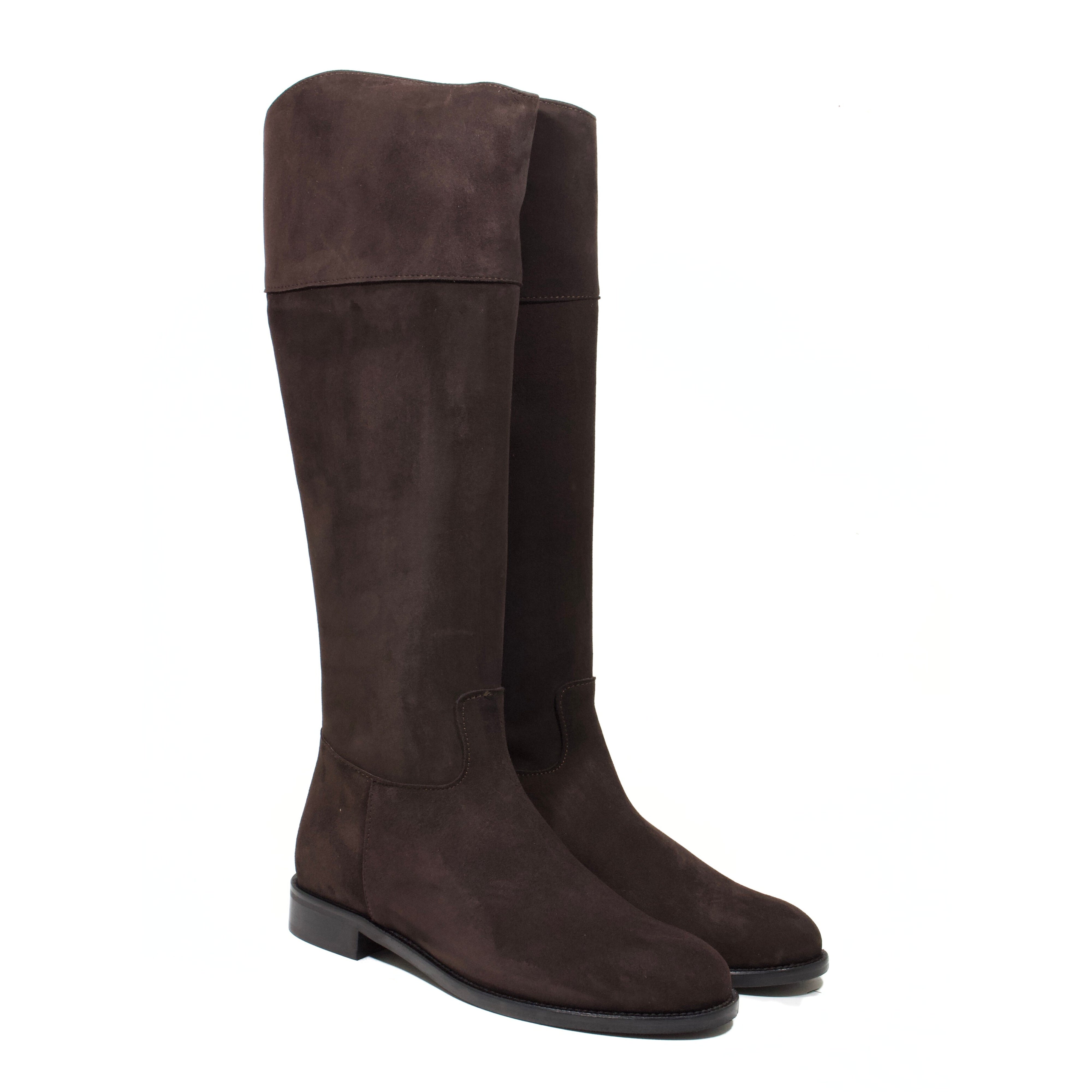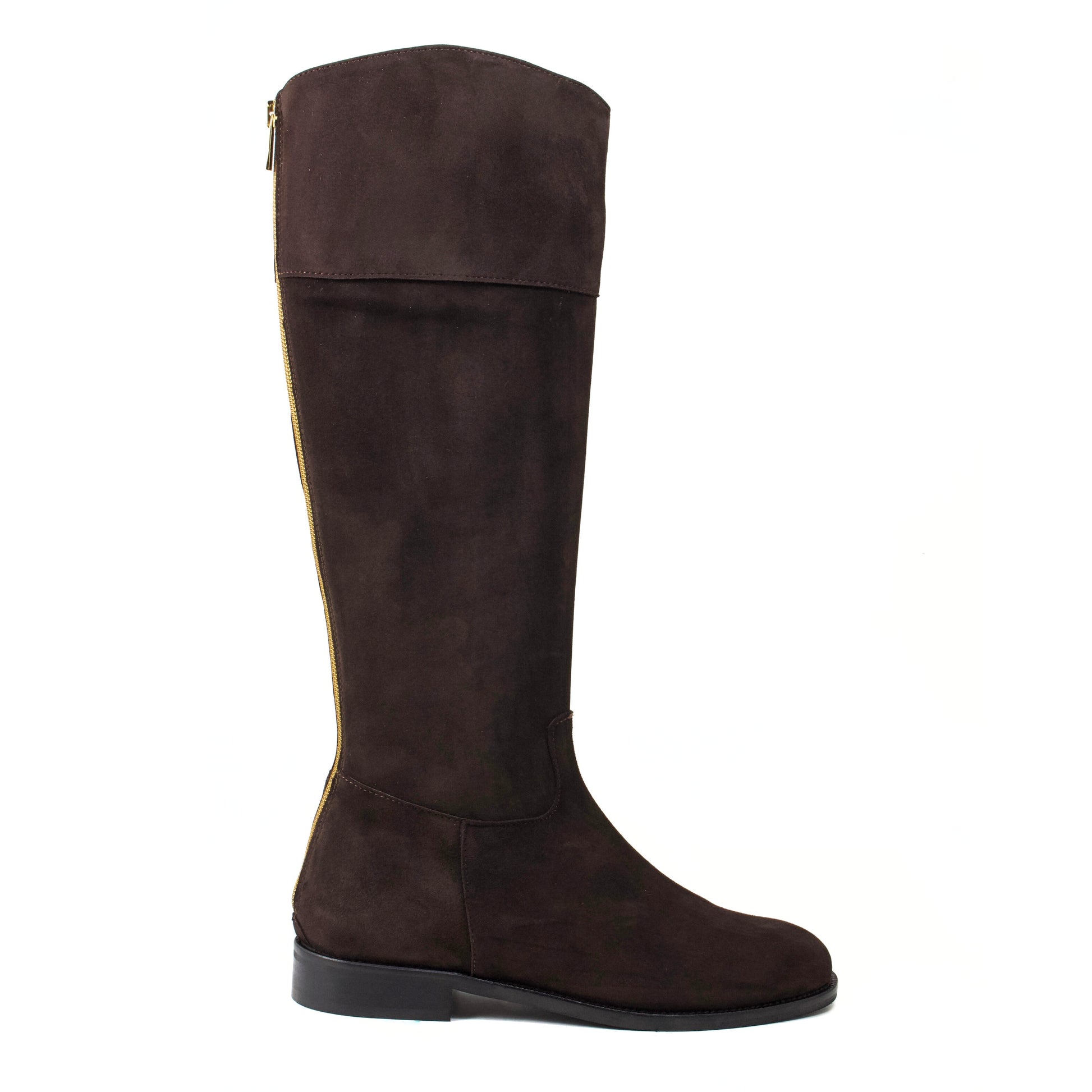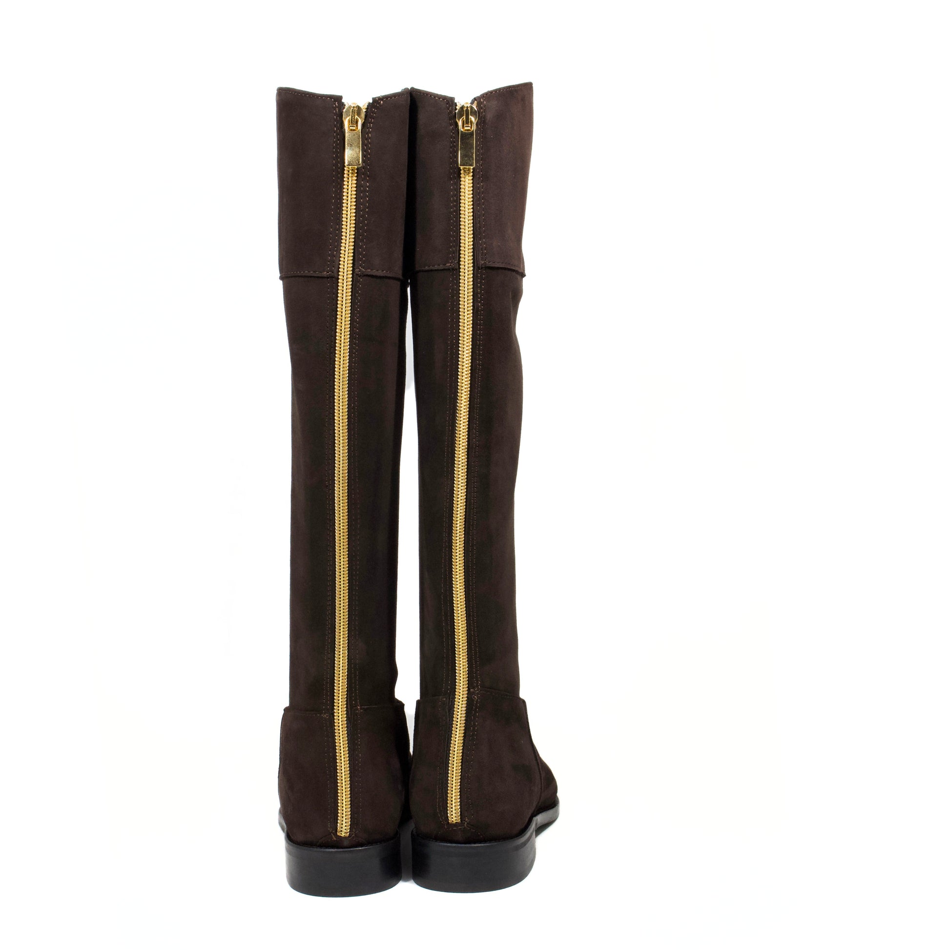 STIVALE ALTO A PUNTA ARROTONDATA IN CAMOSCIO TESTA DI MORO CON ZIP POSTERIORE ORO E TACCO BASSO A BLOCCO