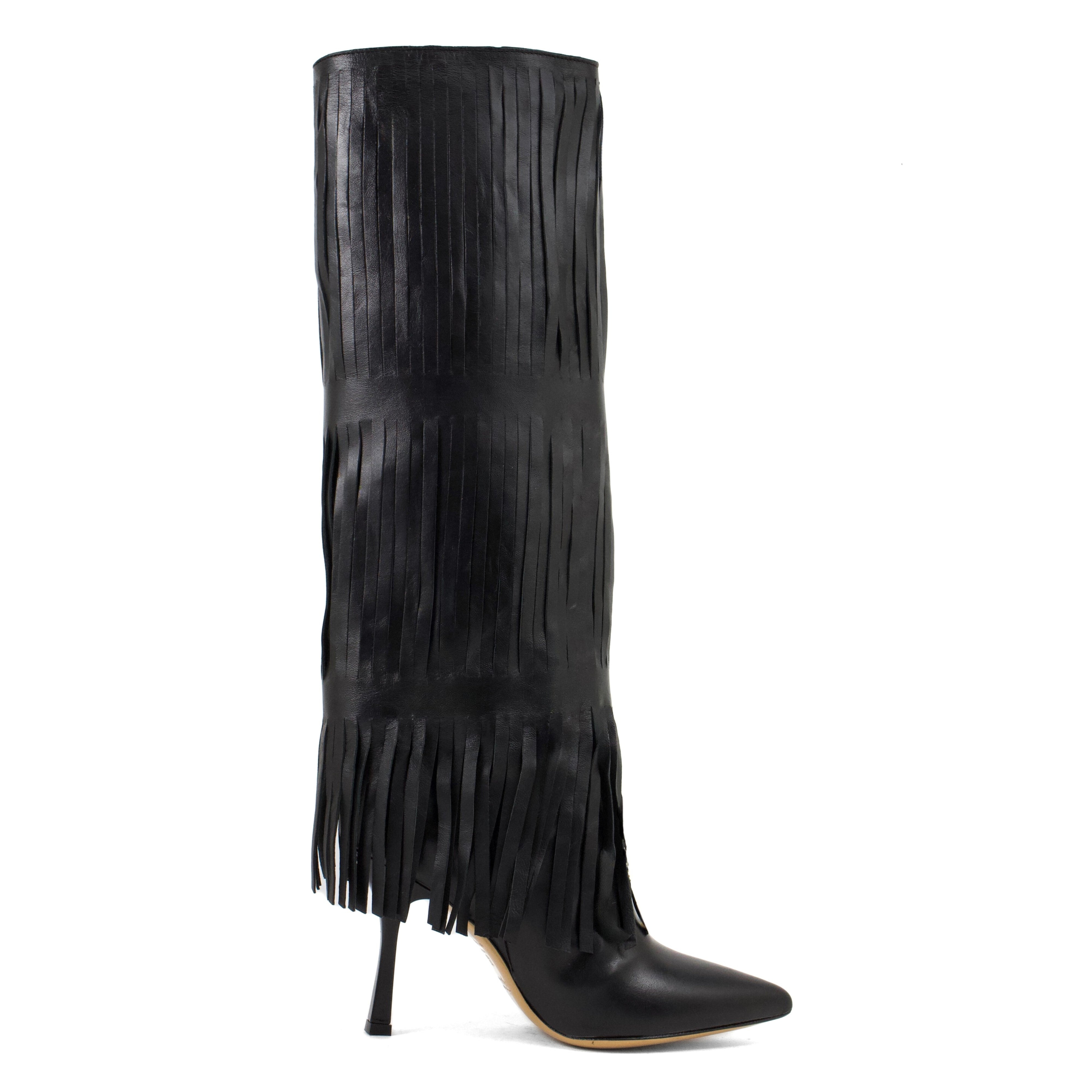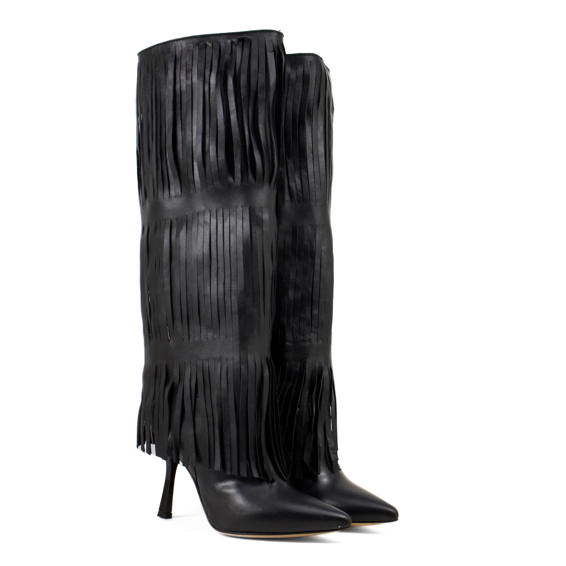 STIVALE ALTO A PUNTA IN NAPPA NERA CON FRANGE E TACCO A SPILLO