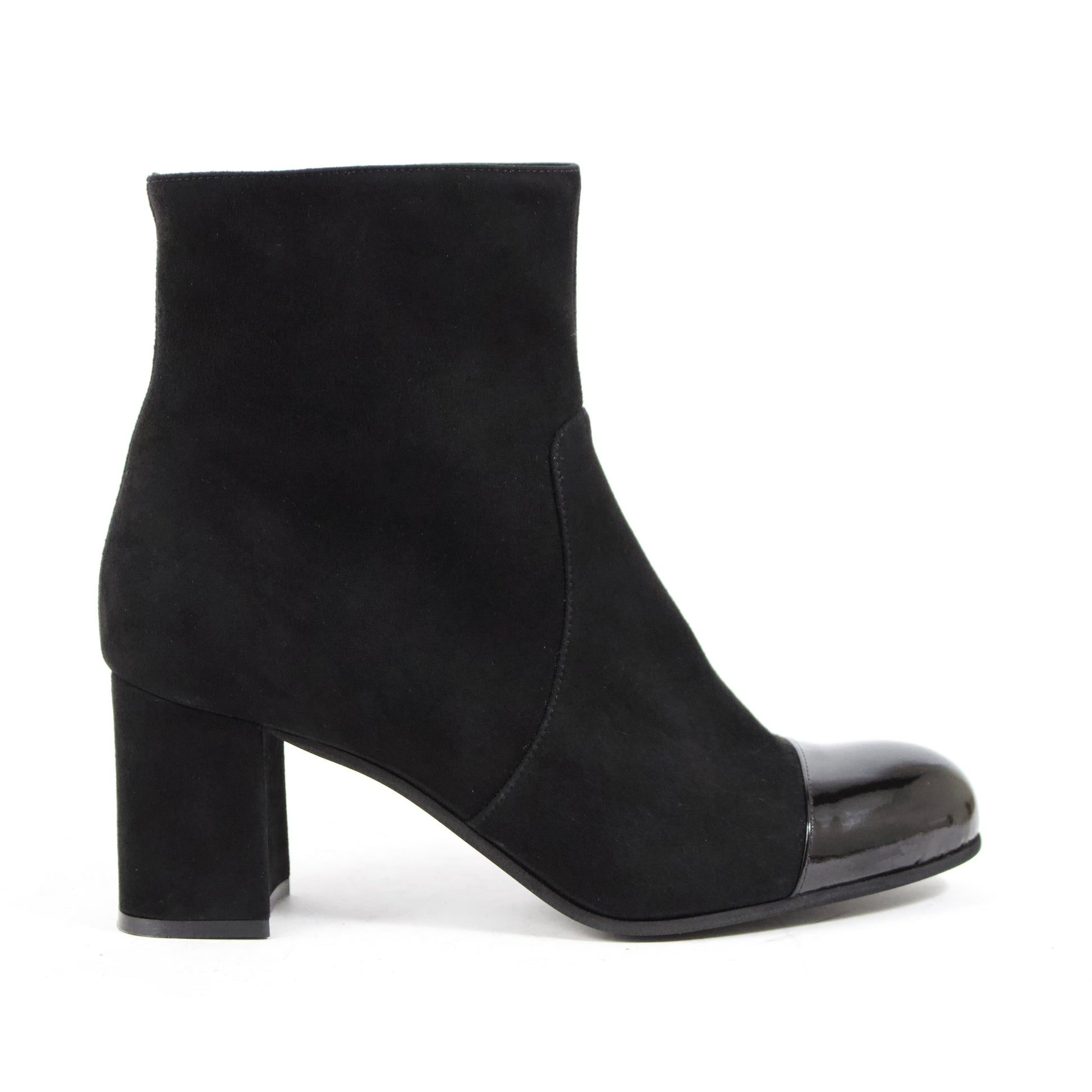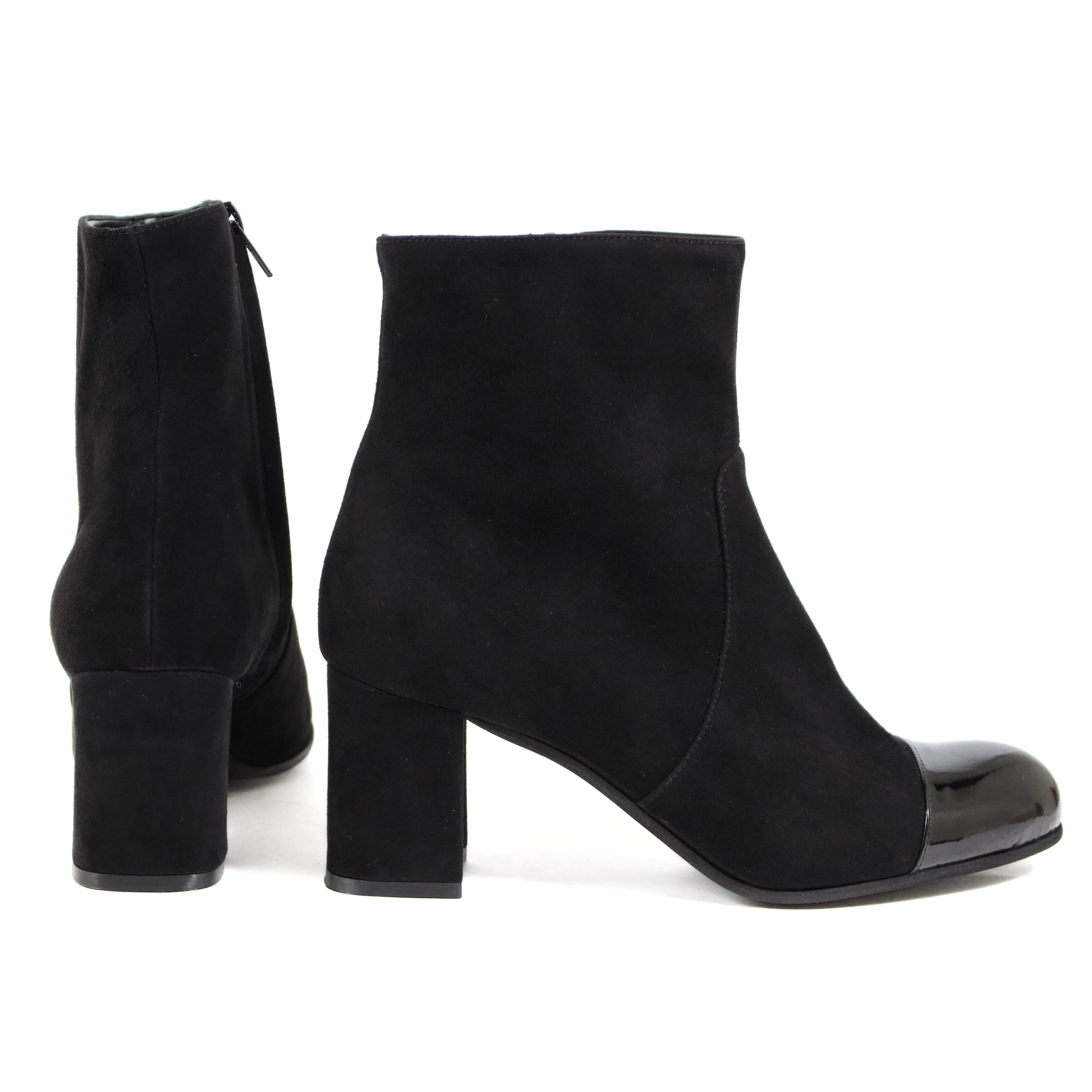 STIVALETTO A PUNTA ARROTONDATA IN CAMOSCIO NERO CON PUNTA IN VERNICE E TACCO MEDIO A BLOCCO