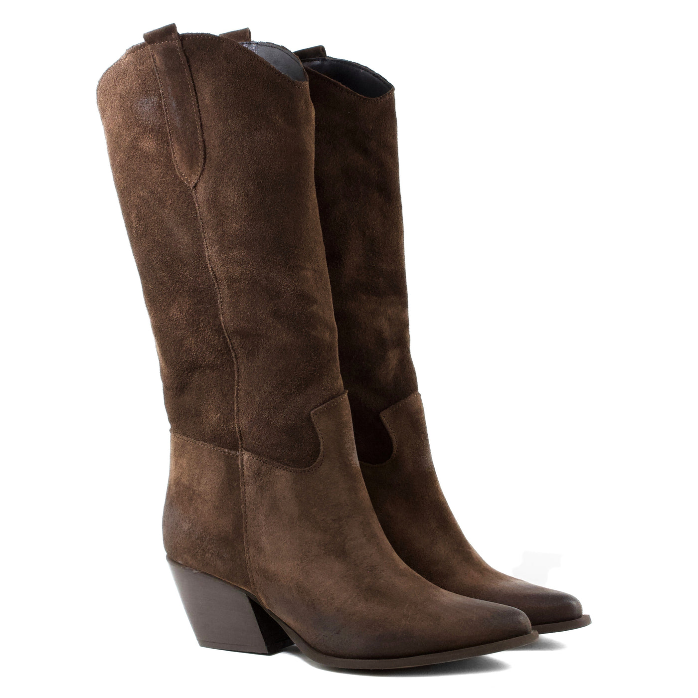 Questi texani in crosta di pelle scamosciata testa di moro sono l'espressione di una sofisticata artigianalità e del design Western contemporaneo con un tacco inclinato di 7 cm che garantisce un effetto slanciato e un supporto ottimale.