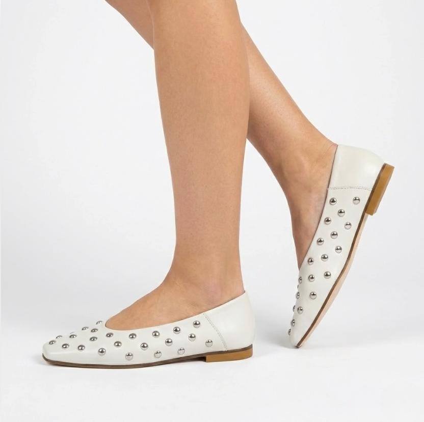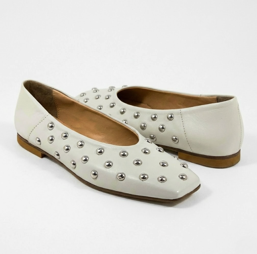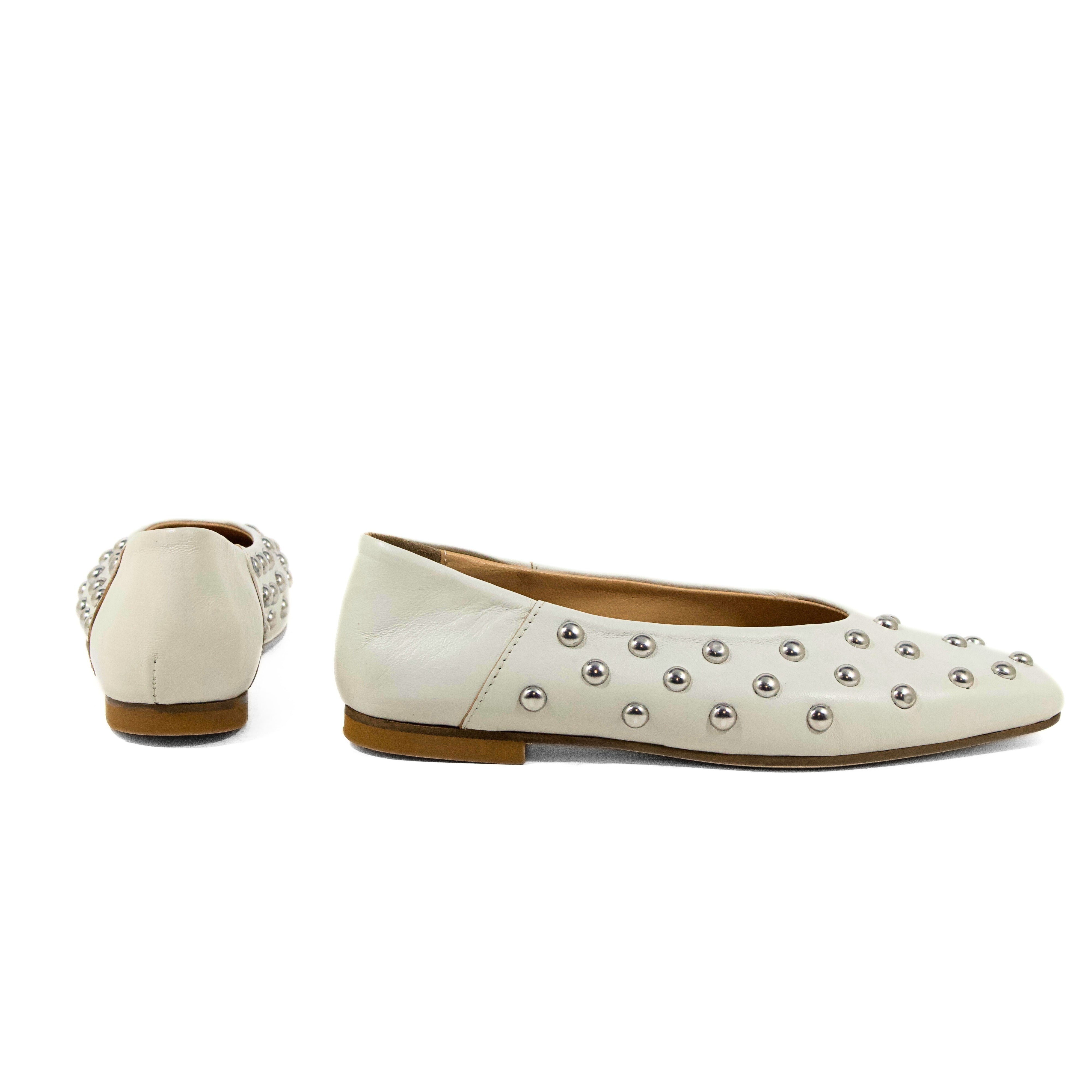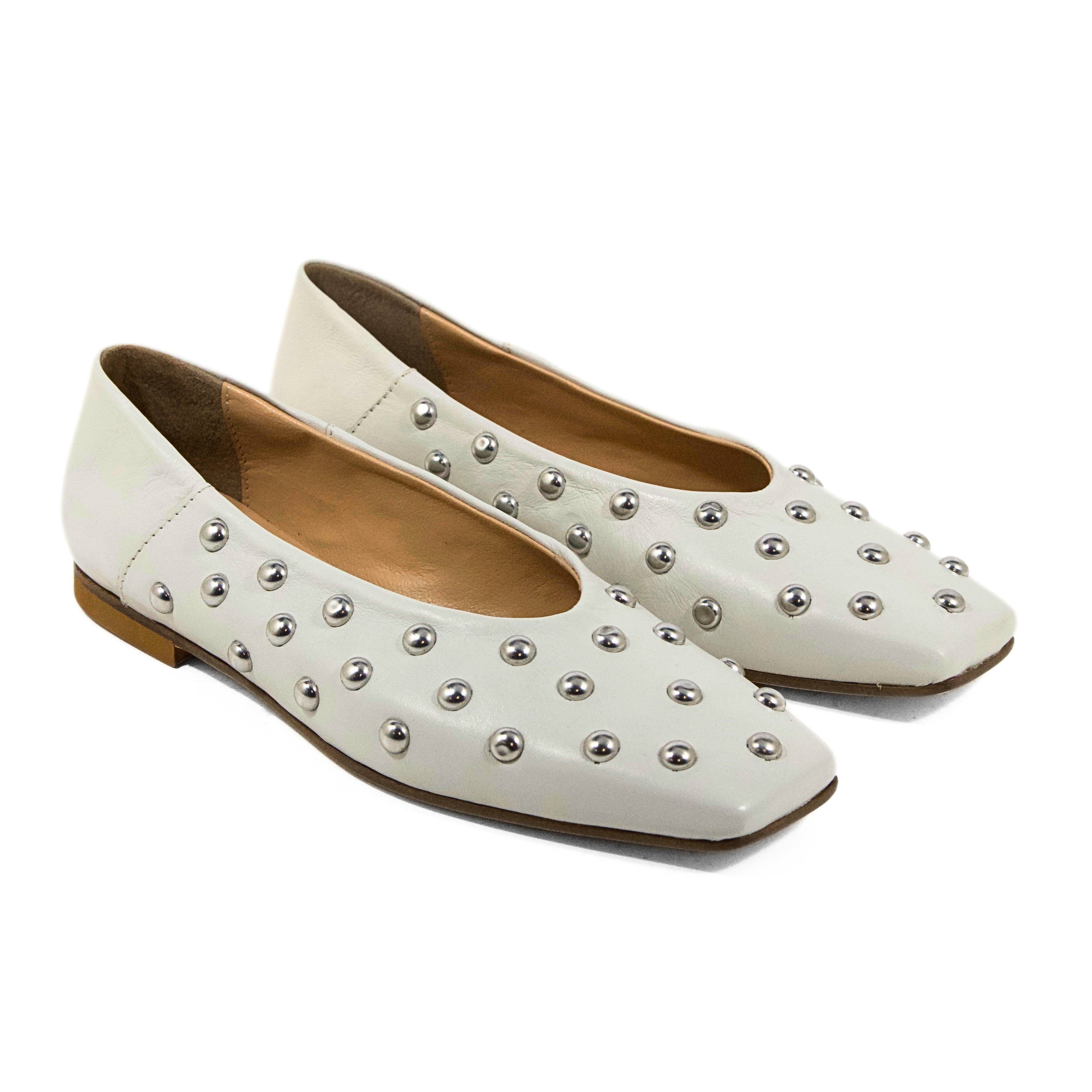 BALLERINA IN NAPPA OFF WHITE CON BORCHIE ARGENTO E PUNTA SQUADRATA