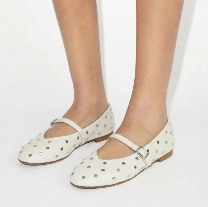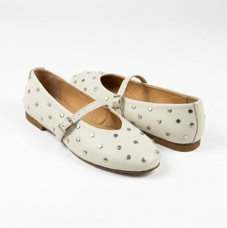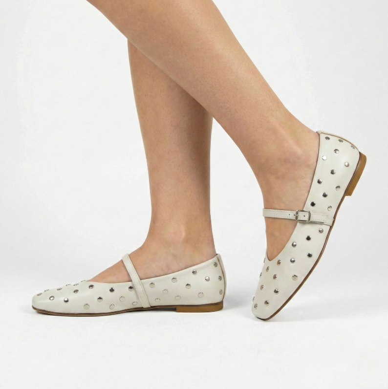 BALLERINA MARY JANE IN NAPPA OFF WHITE CON BORCHIE ARGENTO E CINTURINO