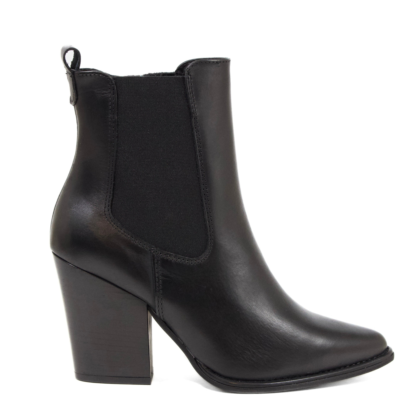 Questi stivaletti in pelle di vitello nera fondono l'eleganza con un tocco biker e western di tendenza.