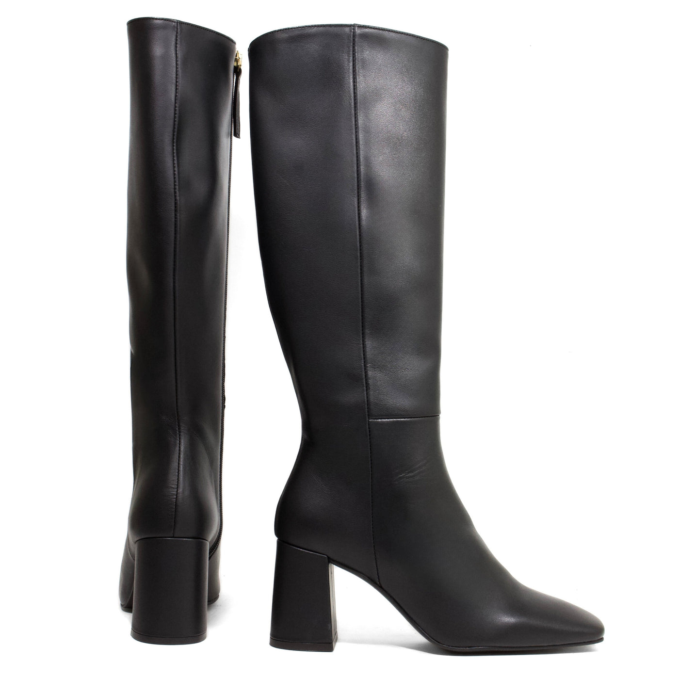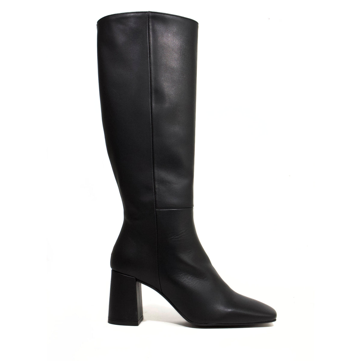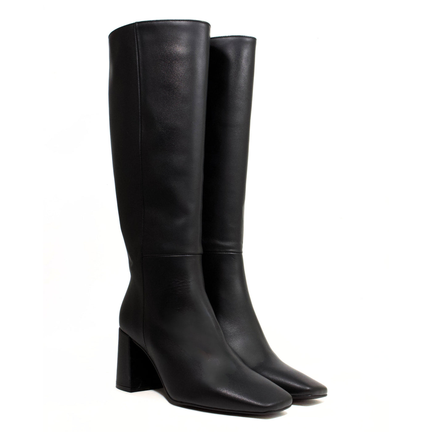 Questi stivali a gambale alto sono un must-have di eleganza e design moderno. Realizzati in vera pelle nera di alta qualità, presentano una silhouette pulita e contemporanea.