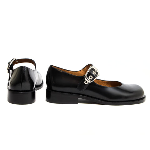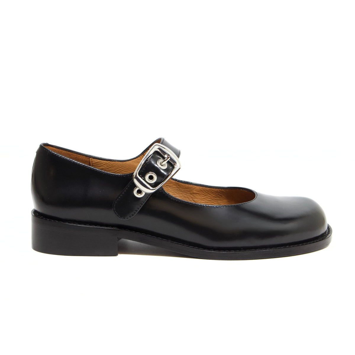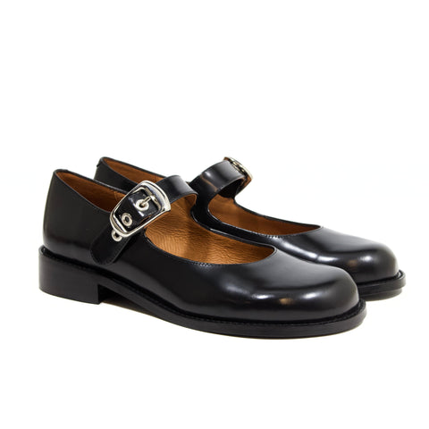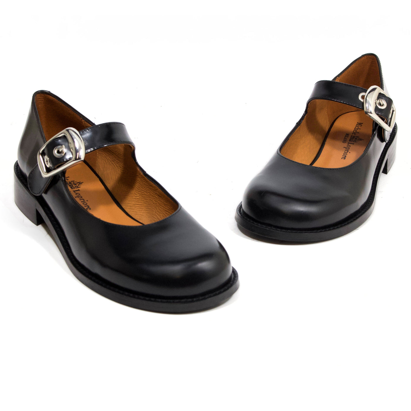 Mary Jane in pelle nera lucida con cinturino regolabile e fibbia in metallo argentato. La punta tonda e il piccolo tacco la rendono un modello intramontabile, confortevole e dal fascino retrò. Perfetta per completare look quotidiani o per aggiungere un tocco sofisticato agli outfit più moderni.