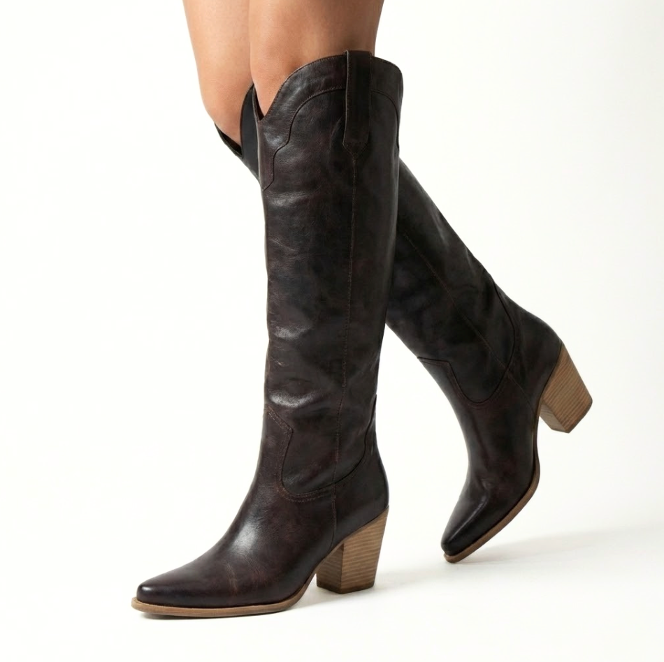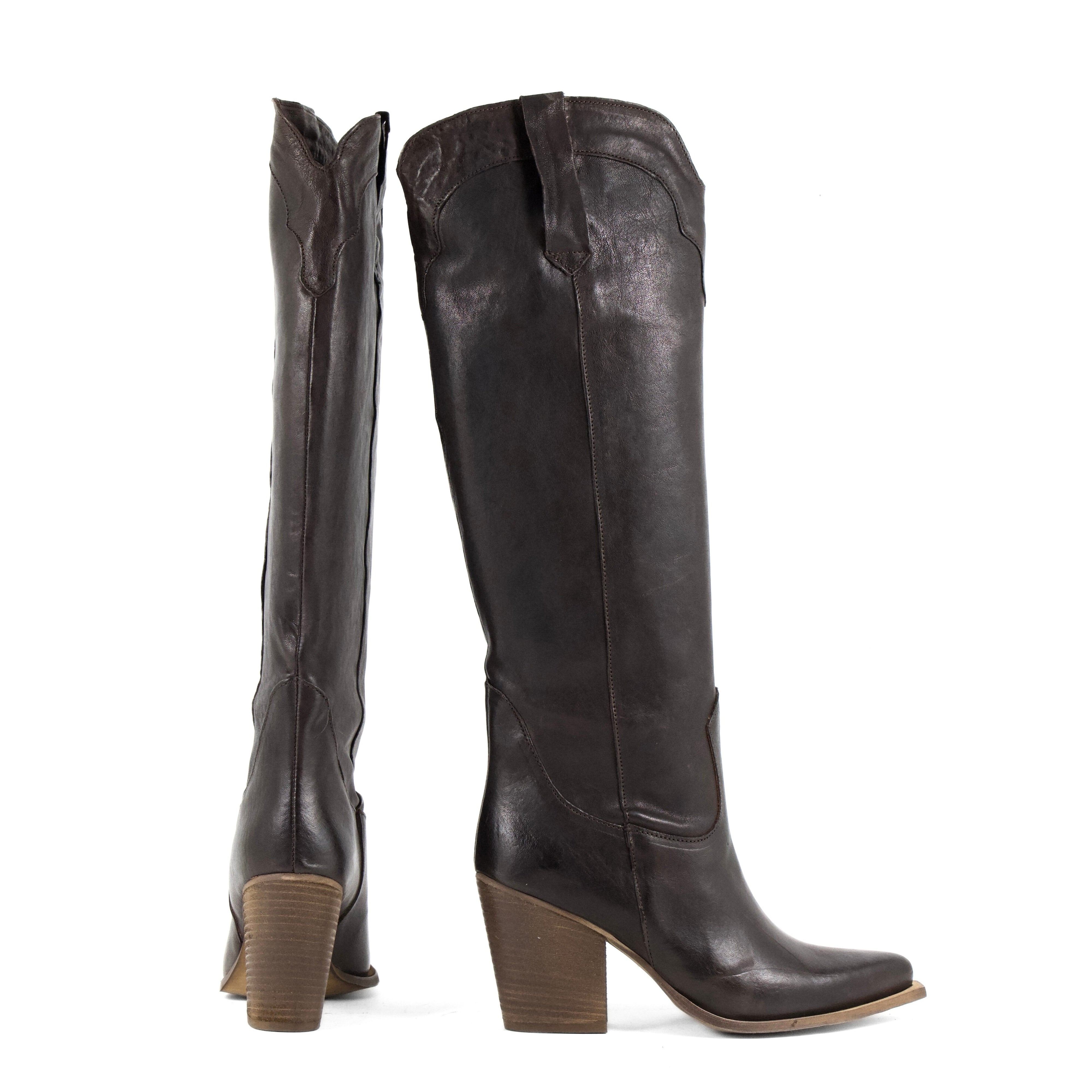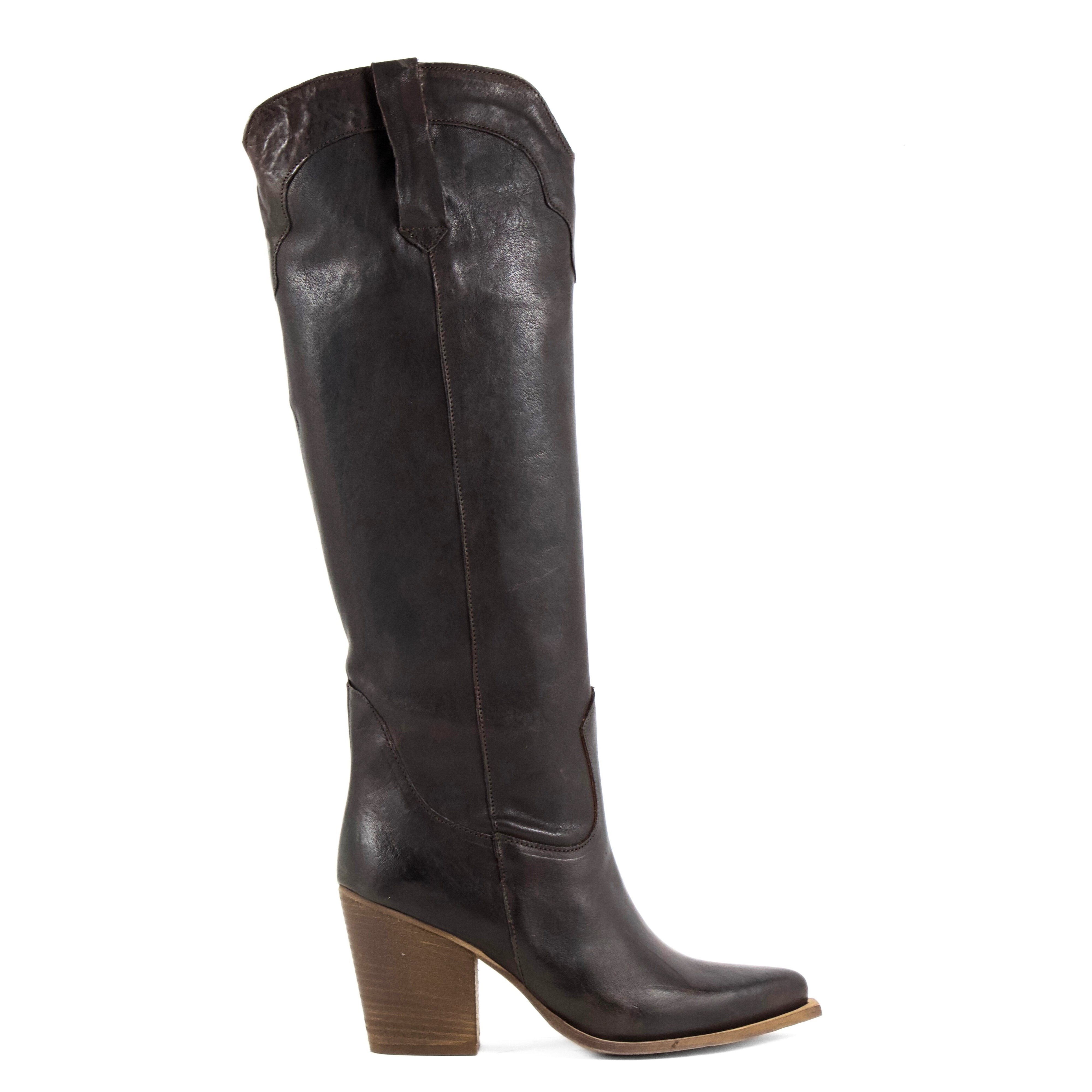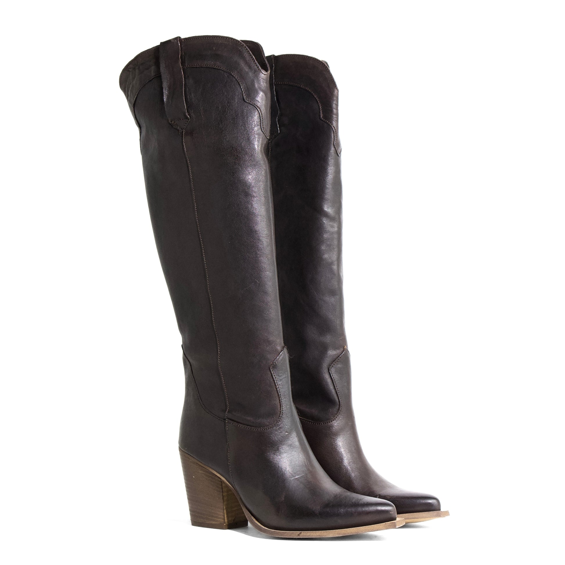 STIVALE CAMPEROS IN PELLE LAVATA TESTA DI MORO CON PUNTA SFILATA E TACCO CUBANO