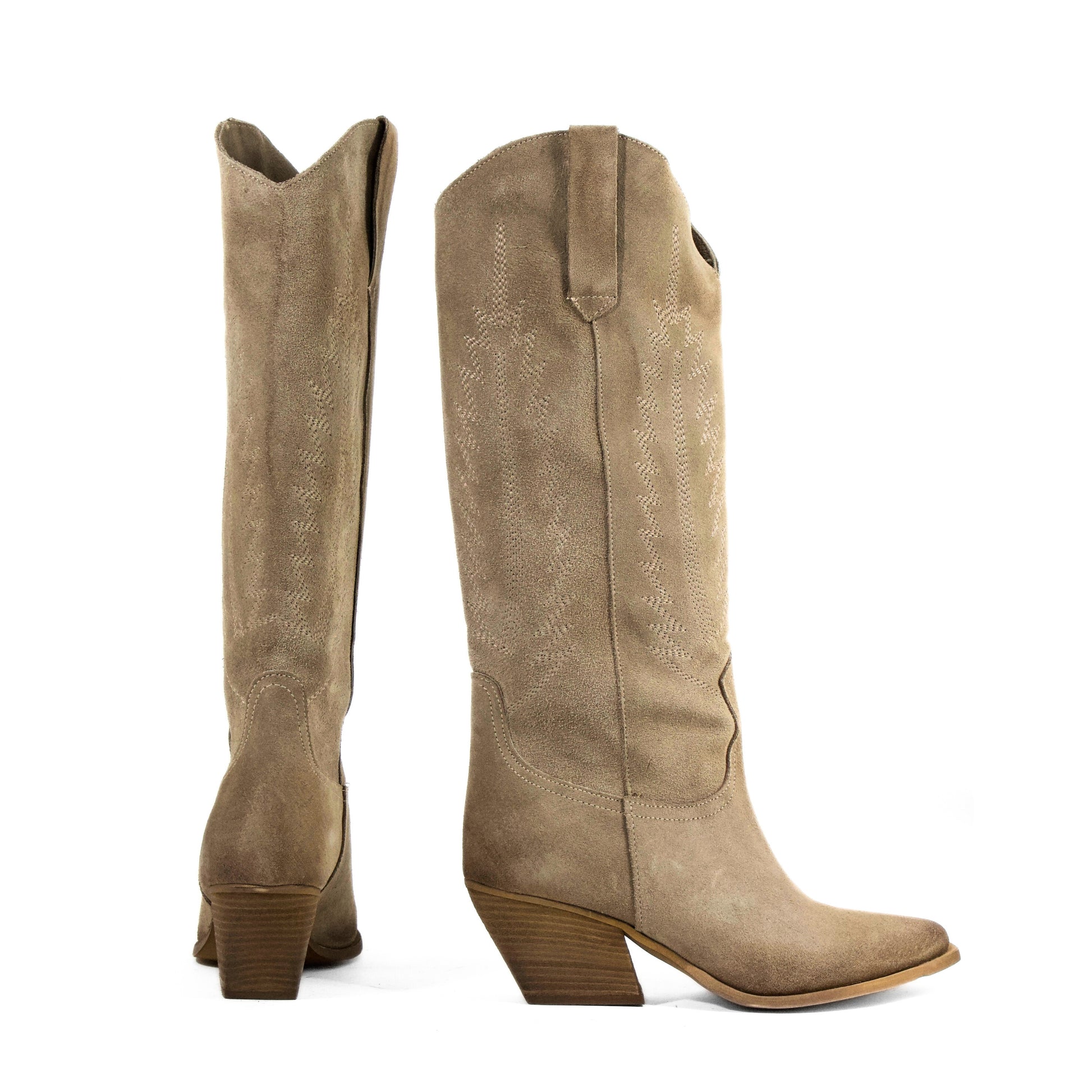 STIVALE CAMPEROS IN CAMOSCIO TAUPE CON PUNTA SFILATA E TACCO CUBANO