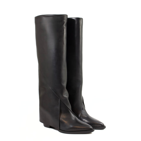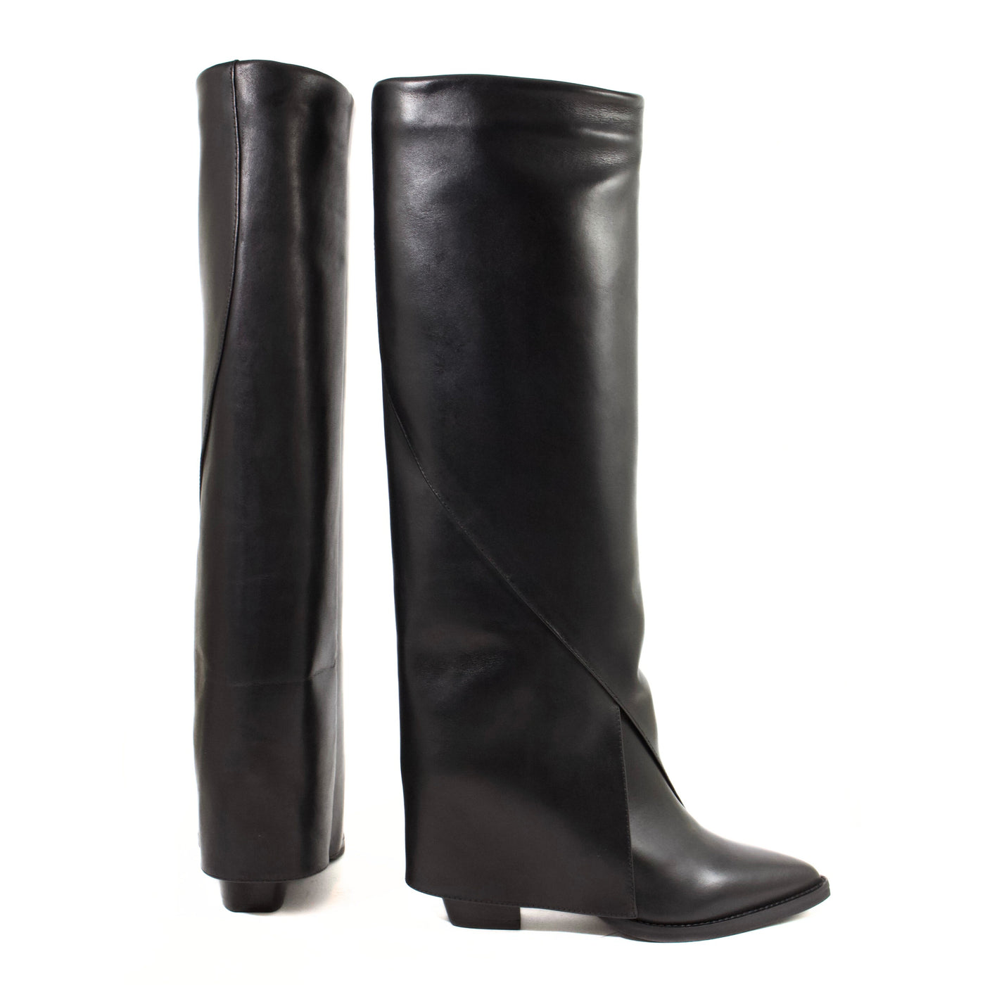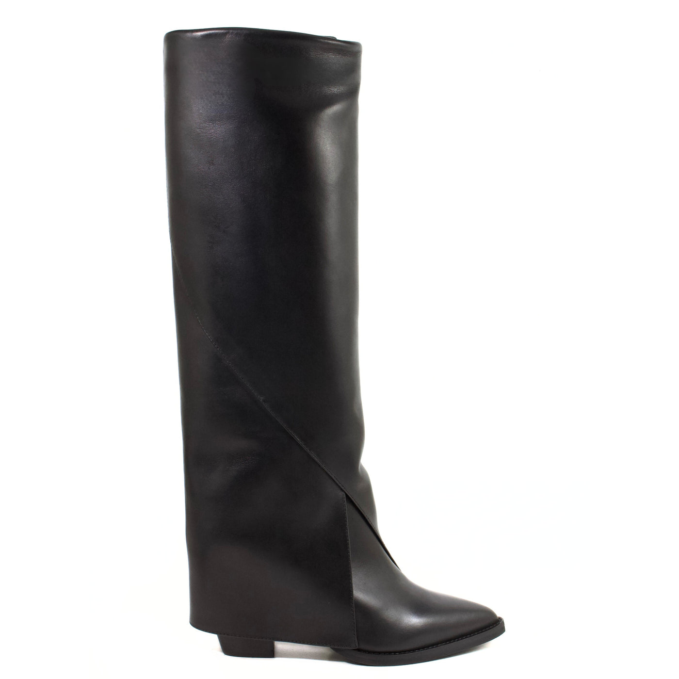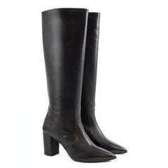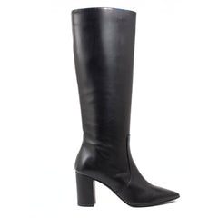 Stivale alto in vitello morbido nero, caratterizzato da linee pulite e sofisticate.